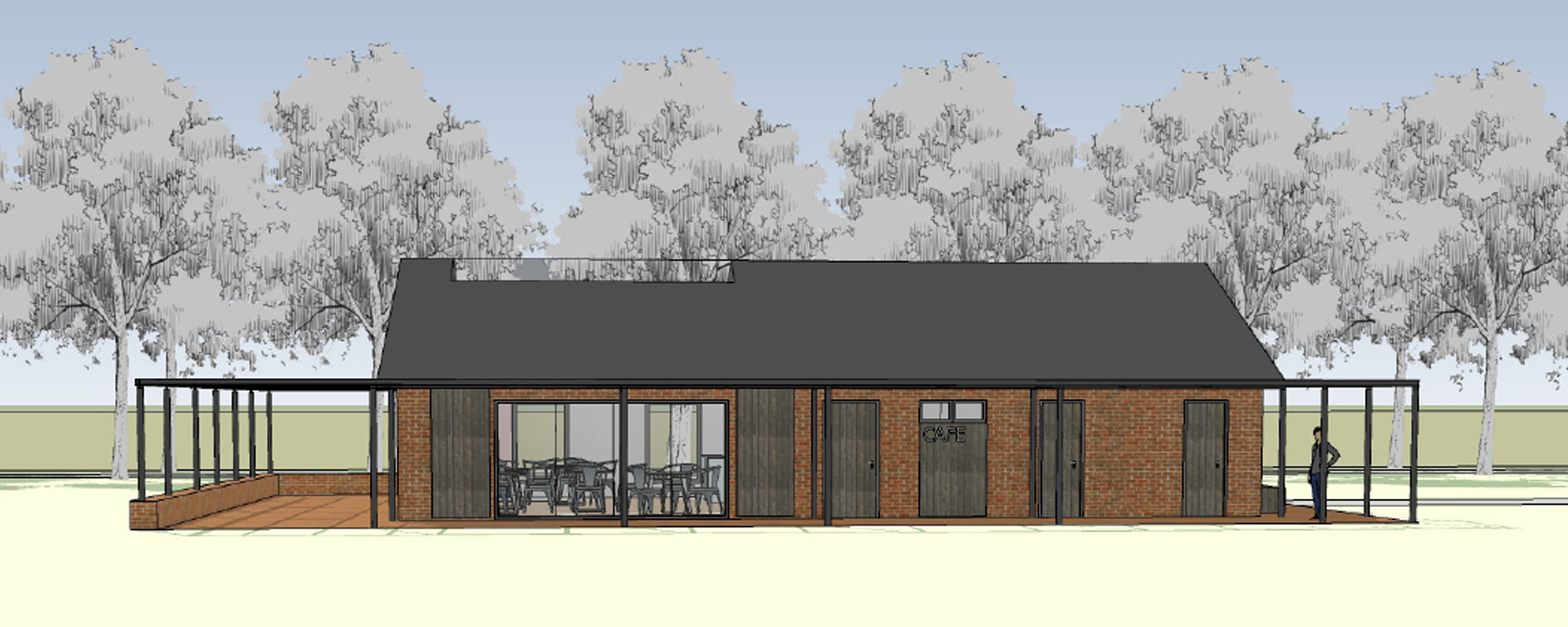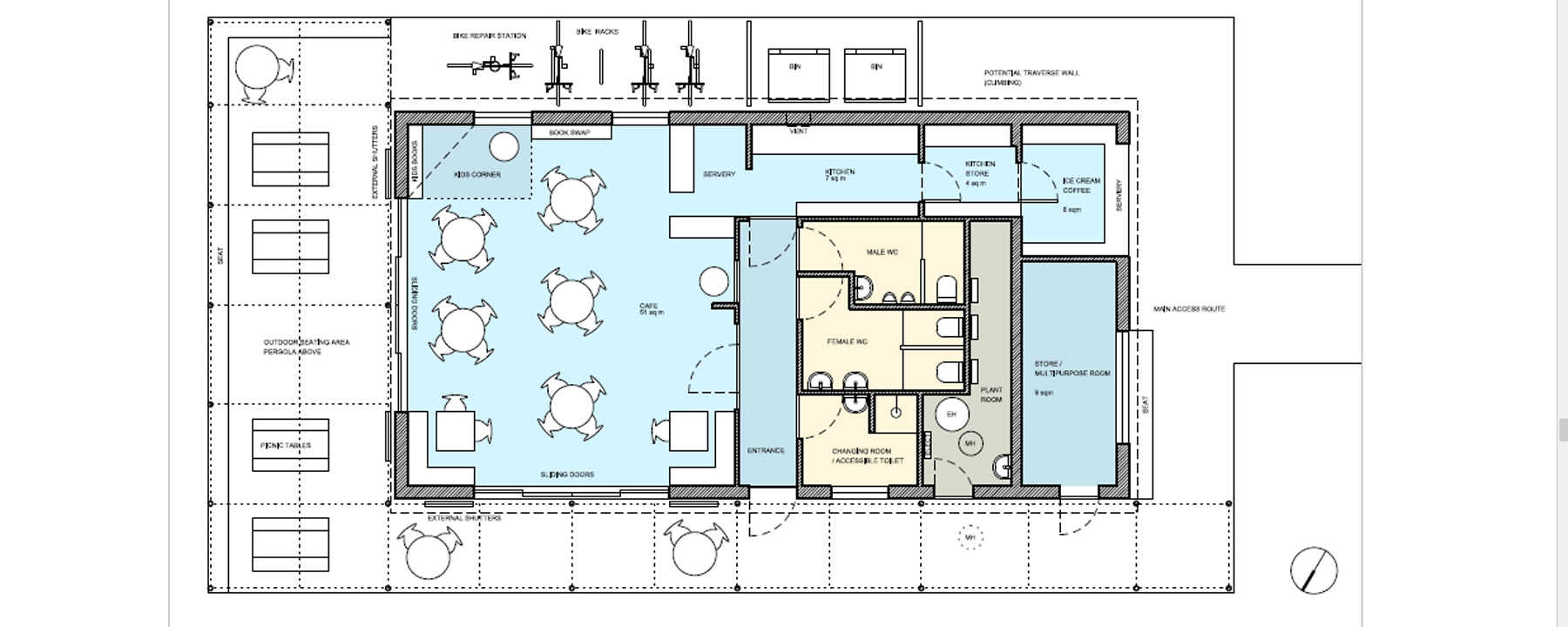 The building would need new windows and entrances, and potentially a pergola around the outside. There would be areas for sitting inside and outside, and a variety of possible features.